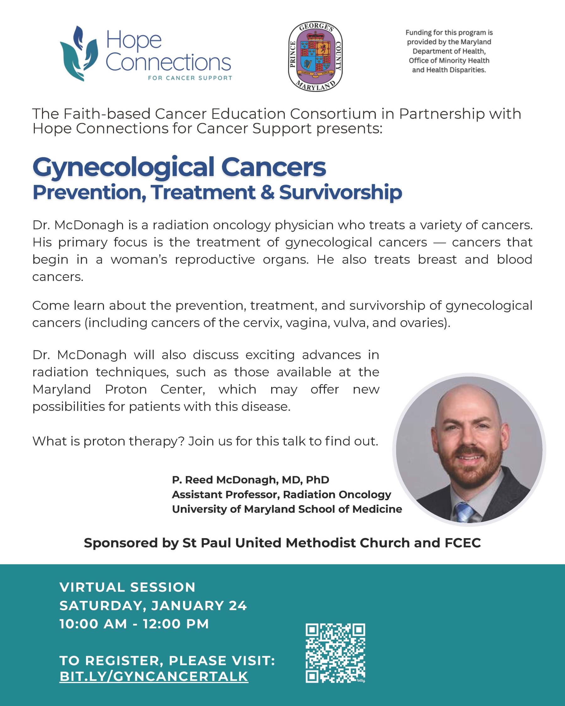 Join the Faith-based Cancer Education Consortium in Partnership with Hope Connections for Cancer Support as it presents Dr. McDonagh who will discuss the prevention, treatment and survivorship of gynecological cancers as well as other topics. See flyer for additional information.